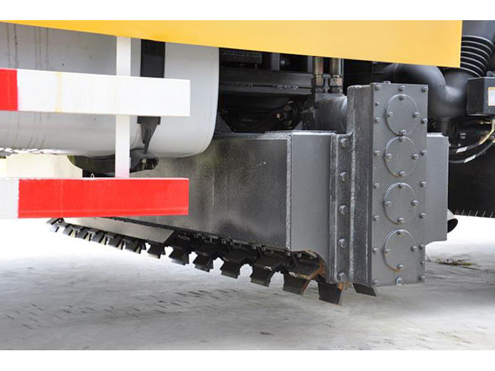 20、破冰装置采用双破冰辊形式,液压系统驱动前后破冰辊强力转动,在振动梁击振力的作用下,对冰雪路面进行纵向和横向冲击破碎,主要应用于压实雪和结冰路面。